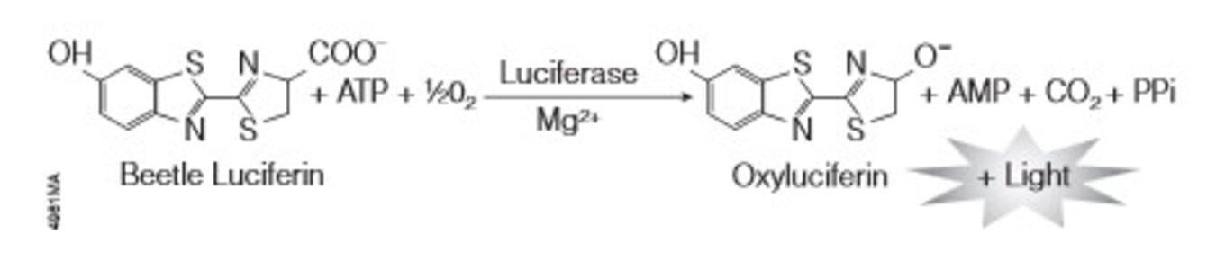 La réaction enzymatique est arrêtée par ajout d’une luciférine et de sa luciférase qui, en présence de Mg 2+ et d’ATP, catalyse son substrat en oxyluciférine avec émission d’un photon.
