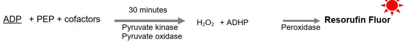 L’ADP est transformé en peroxide d’hydrogène, lui-même détecté grâce à une peroxidase en présence de son substrat (Amplex Red) par la production de Résorufine fluorescente.