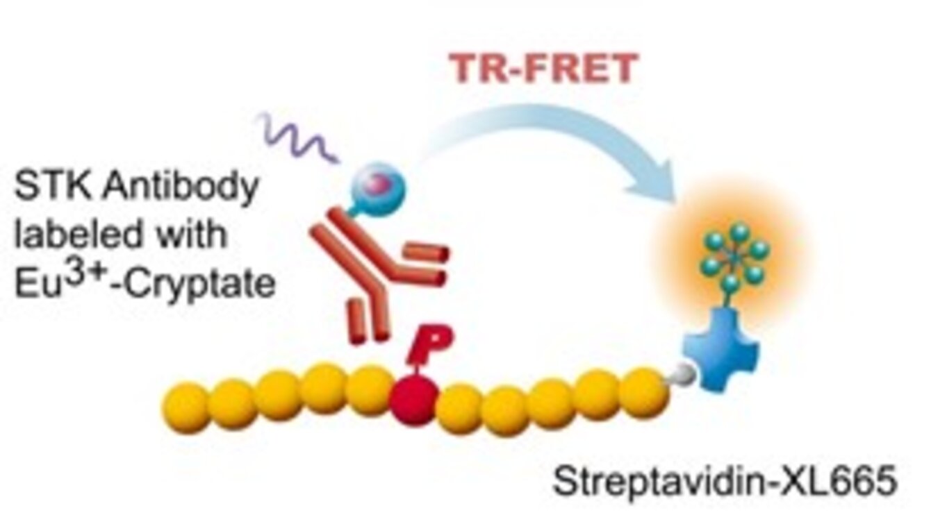 Deux fluorophores partenaires donneur (cryptate d’europium) / accepteur (XL665) sont fusionnés respectivement à un anticorps spécifique de la phosphorylation et à la streptavidine qui se lie au substrat biotynilé.