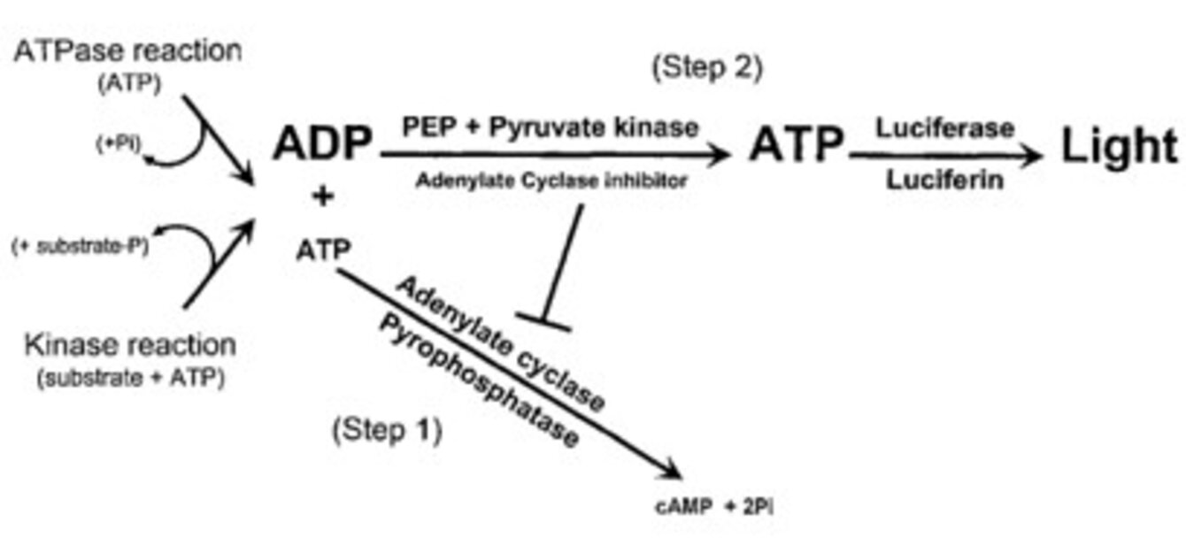 Un second réactif est alors ajouté pour convertir l’ADP produit en ATP qui lui-même est dosé par une réaction luciférine/luciférase.