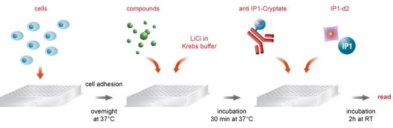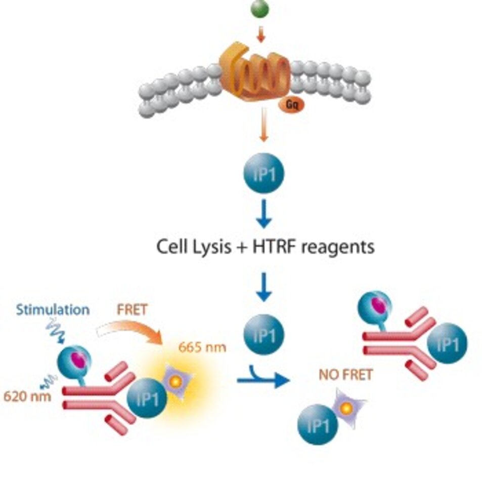 La détection des seconds messagers intracellulaires comme l’IP1, produit suite à l’activation des récepteurs couplés aux protéines Gq, peut être réalisée par la technologie HTRF®.