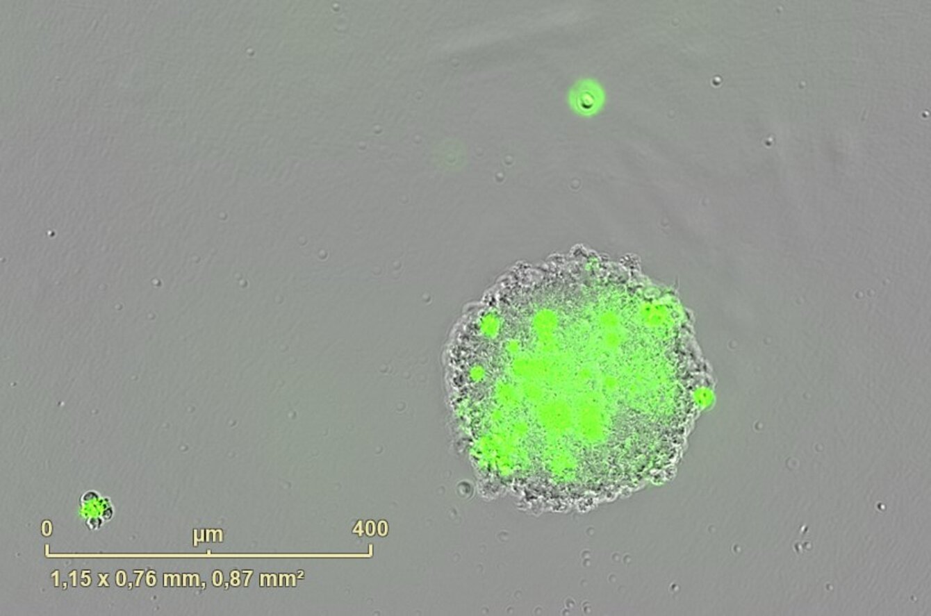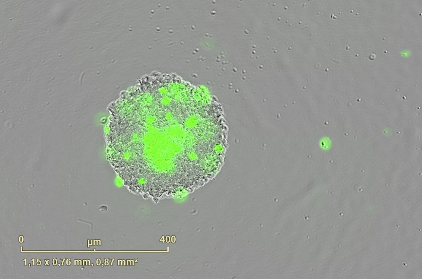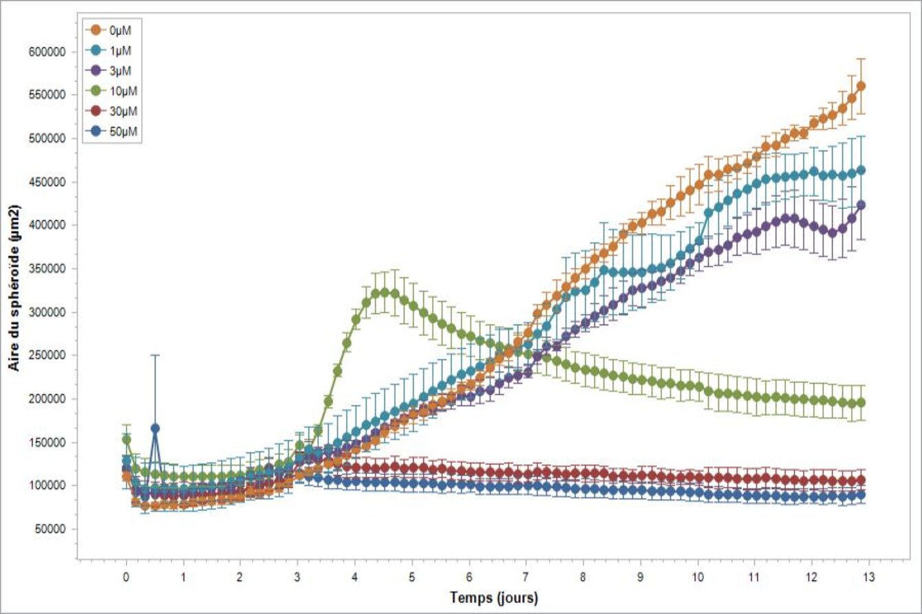 PCBIS propose un essai miniaturisé en microplaque sur sphéroïde de cellules de tumeur glioneuronale maligne pour l’évaluation de l’effet cytotoxique de composés. Celui-ci peut être quantifié soit par le suivi de la viabilité des sphéroïdes, soit par le suivi de la croissance des sphéroïdes.