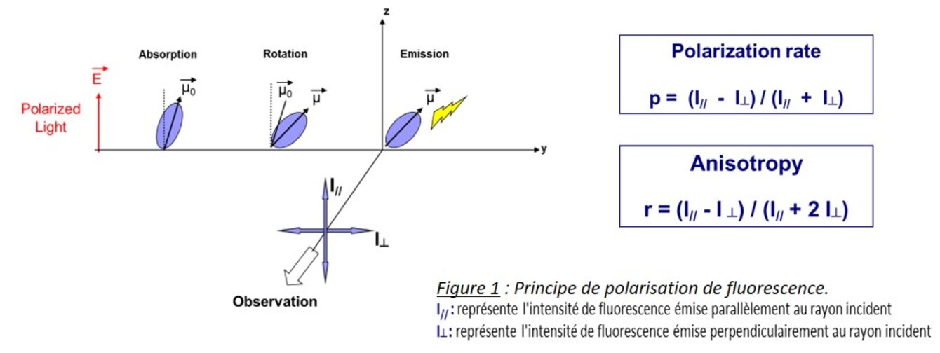 Le degré de polarisation de fluorescence, défini par le taux de polarisation (p) ou par l’anisotropie (r), permet de mesurer les changements d’orientation de l’émission de fluorescence après excitation du fluorophore par une lumière polarisée.