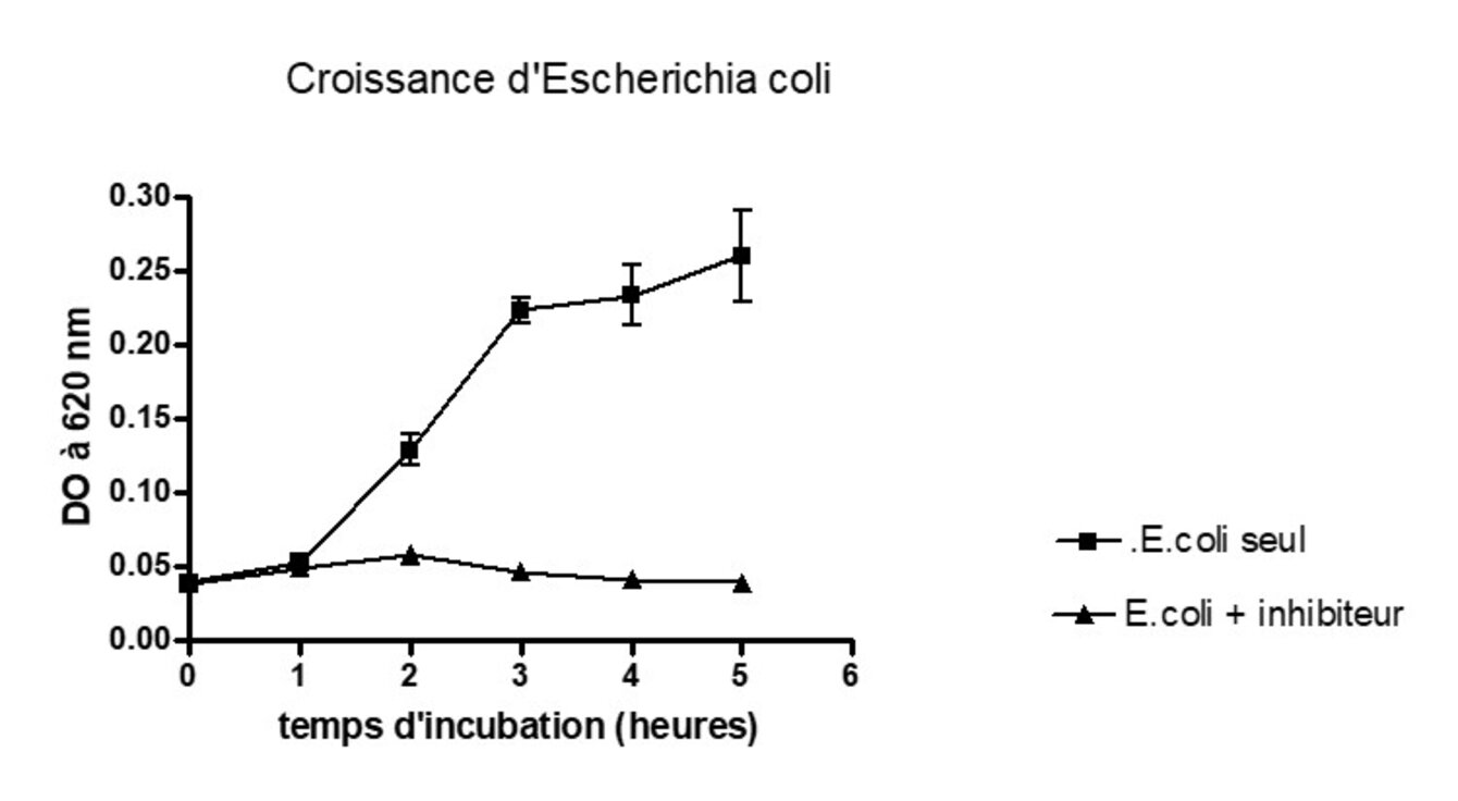 La croissance d’une souche bactérienne est suivie sur plusieurs heures par turbidimétrie en présence des molécules à tester.