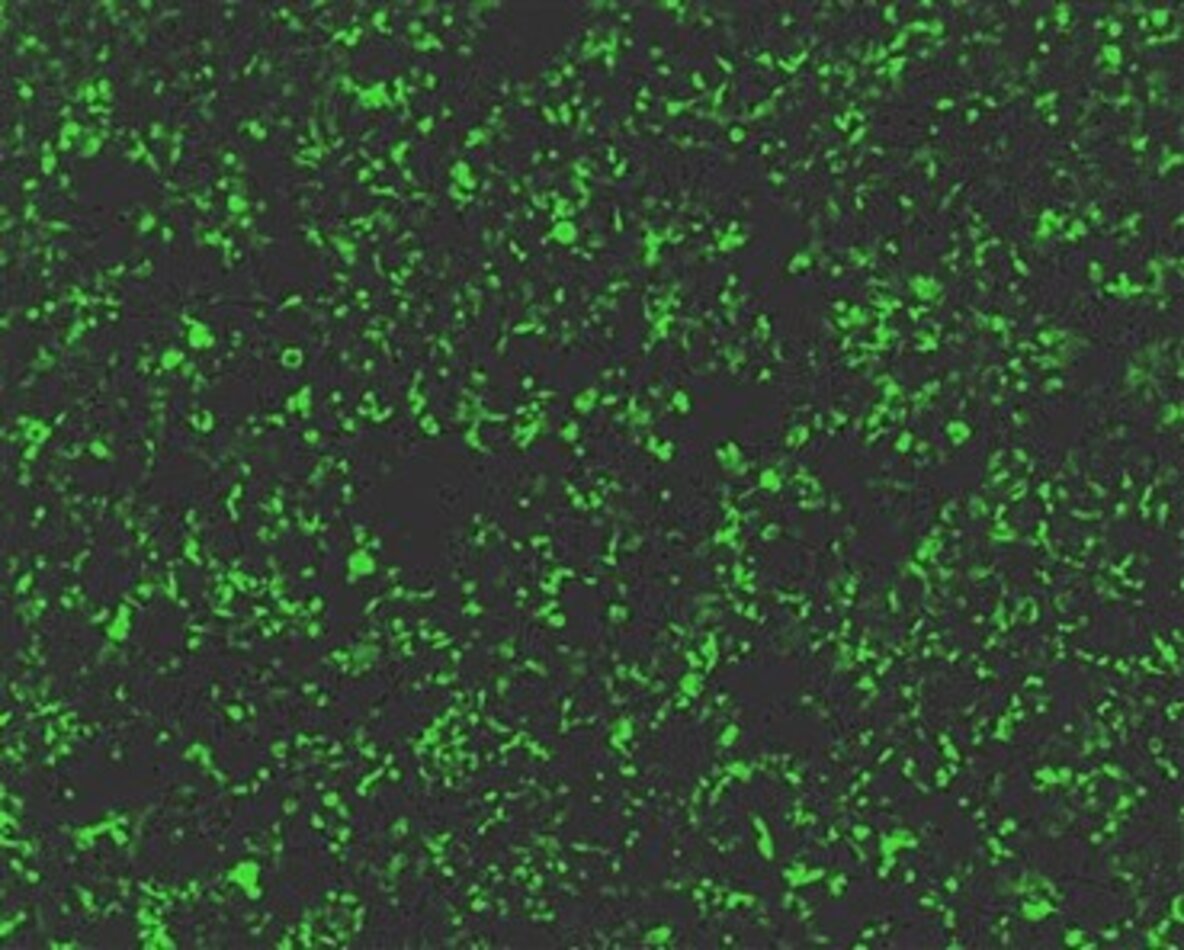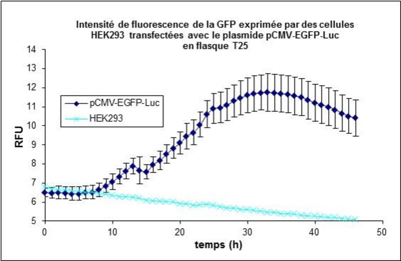 Le suivi de l’efficacité d’une transfection peut être réalisé en suivant l’augmentation de fluorescence dûe à l’expression d’une protéine fluorescente telle que la GFP, transfectée en même temps que le gène d’intérêt.