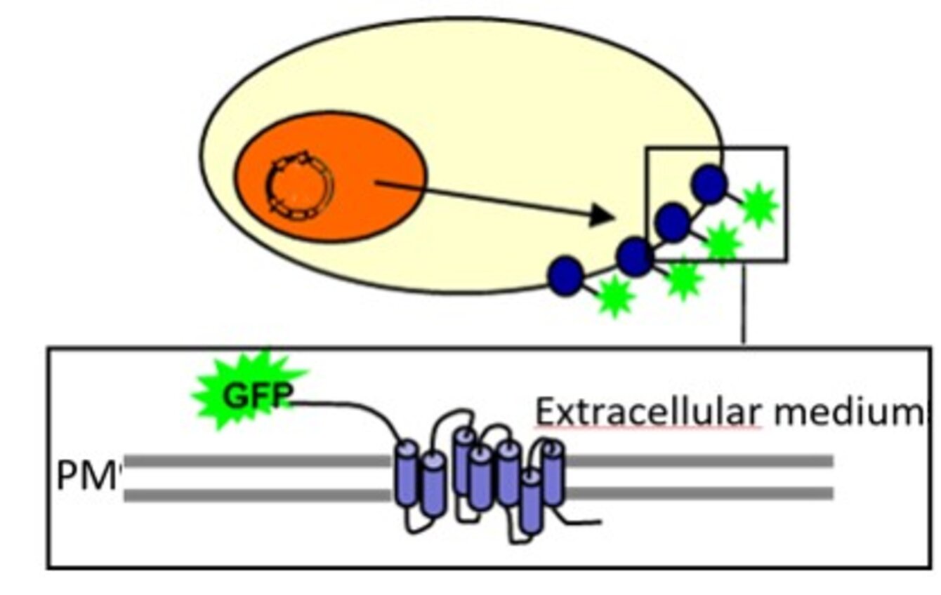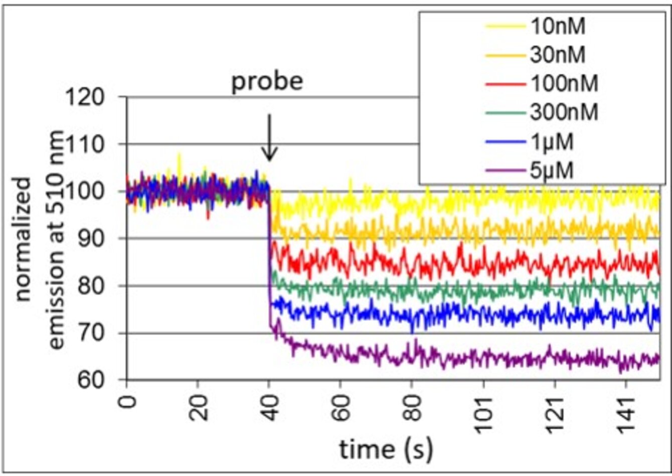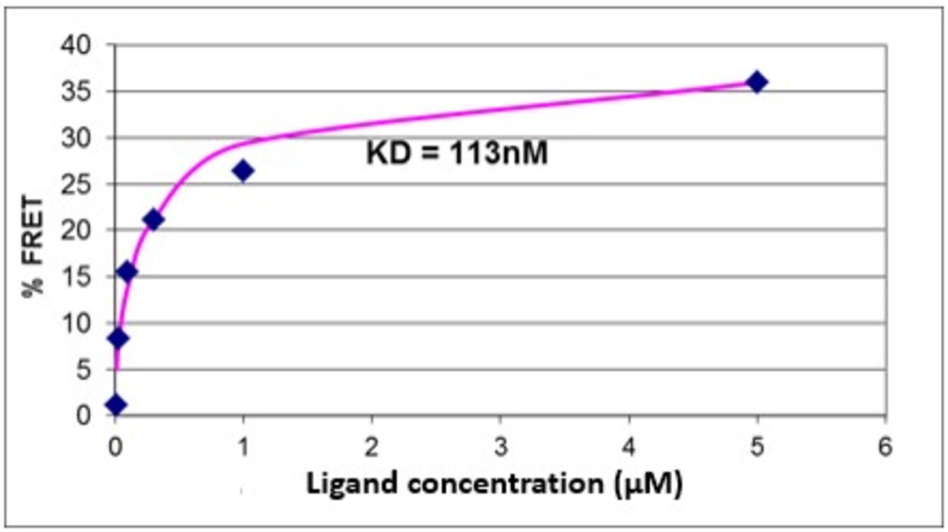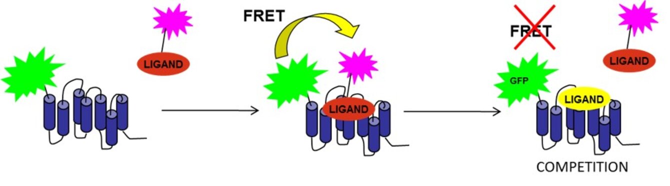 Here, it allows to measure the binding between a membrane receptor fused to a fluorophore and a ligand fused to another fluorophore. The binding is measured on living whole cells. The assay is performed under homogeneous conditions and does not require any washing.