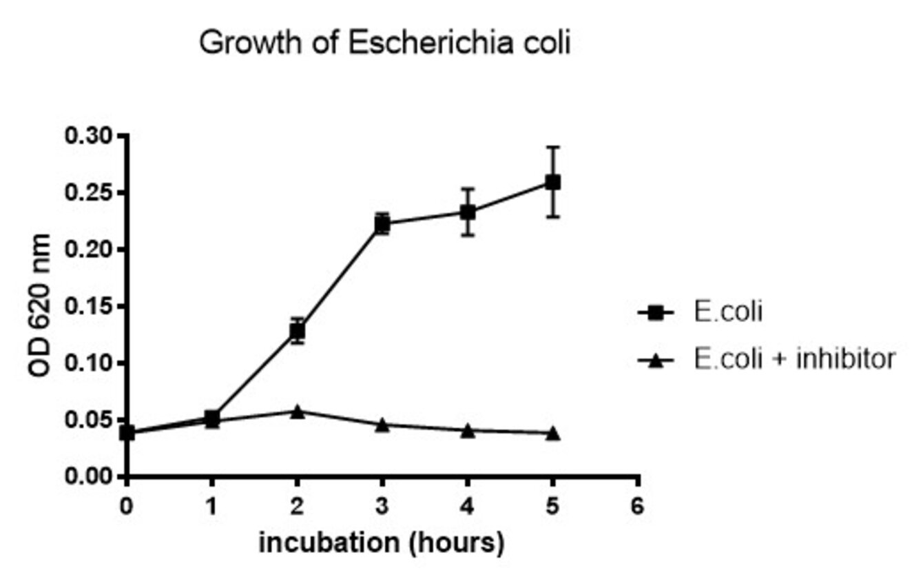 The growth of a bacterial strain is monitored over several hours by turbidimetry in the presence of the molecules to be tested.