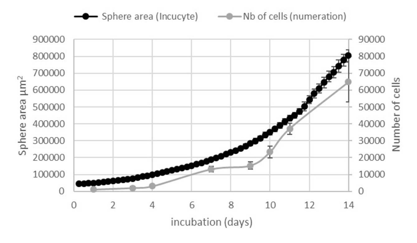 Thus, PCBIS proposes a miniaturized microplate assay to perform cell proliferation kinetics under conventional culture conditions in a controlled atmosphere by quantifying the area of spheroids using the Incucyte S3 (SARTORIUS).